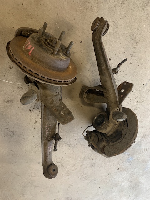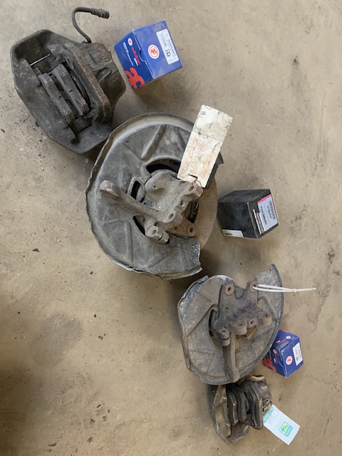 Bromsar fram / bak från Porsche 944, bakre bärarmar de tidiga i plåt (smala spårvidden) med skivor och ok.