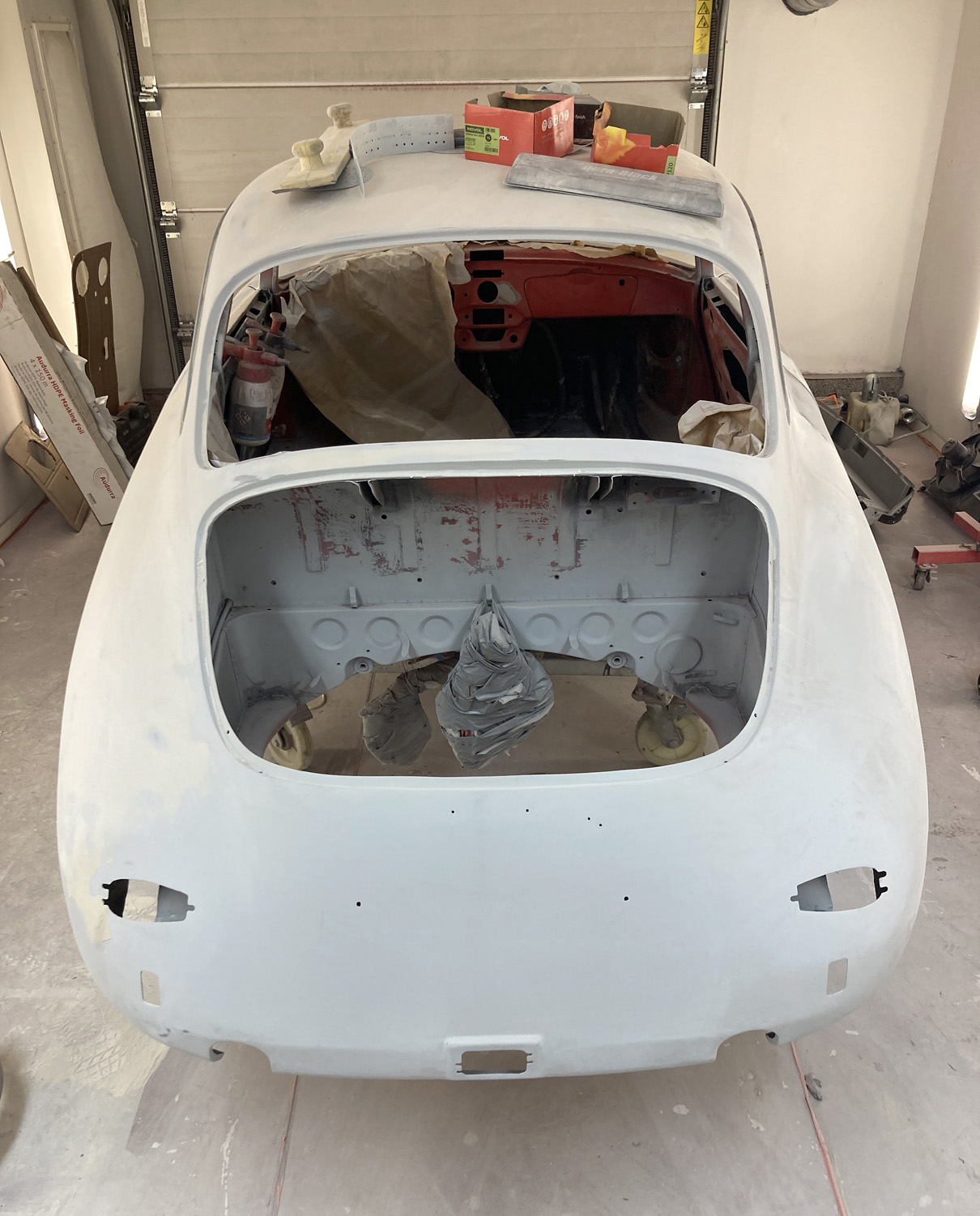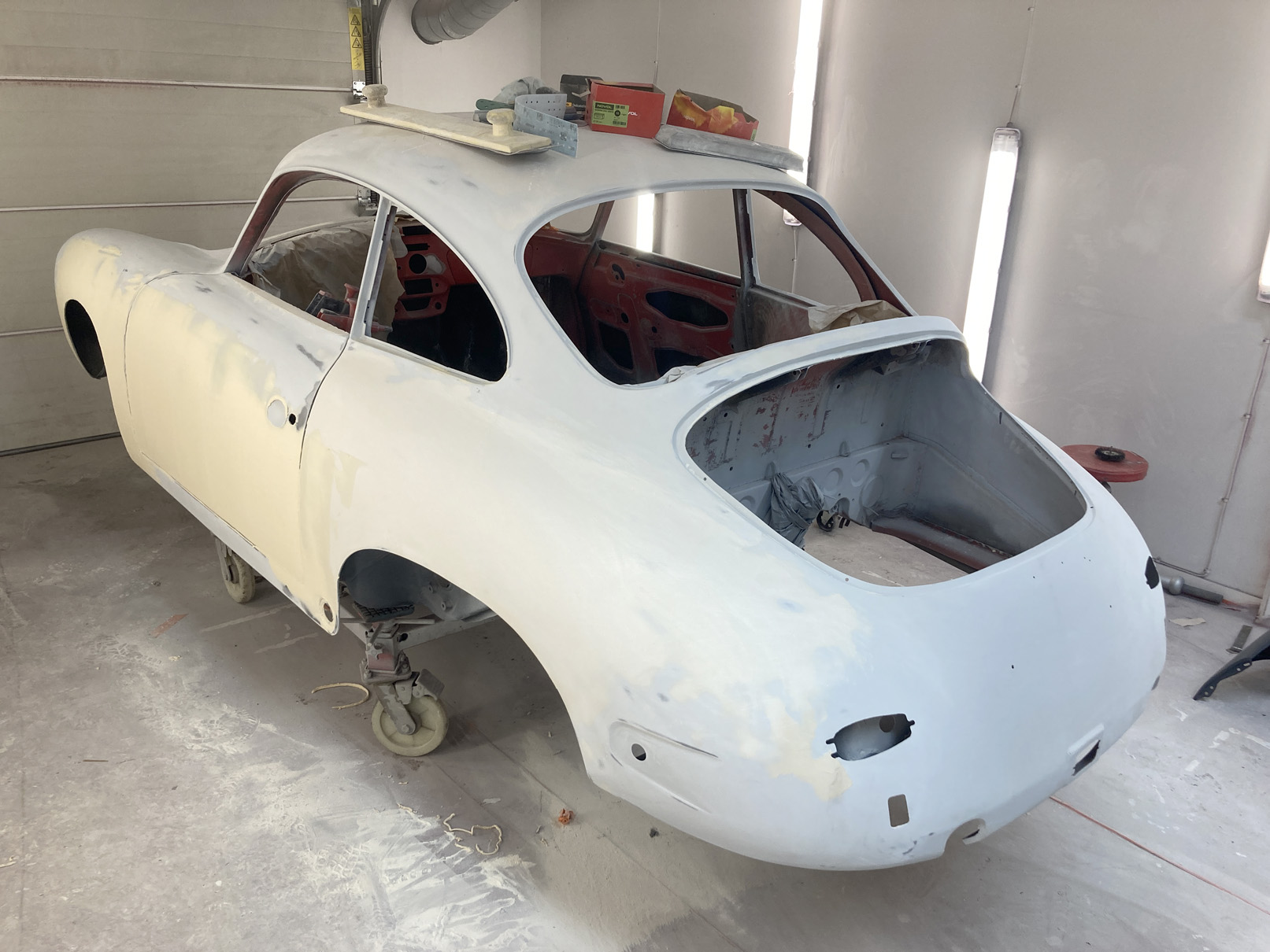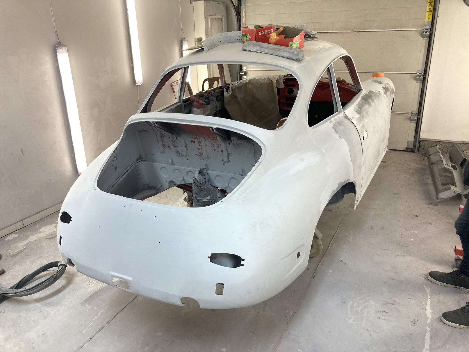Tog en sväng till lackeraren och kollade in hur det går. Snart är det dags för lack! Så här ser det ut nu när all "bodywork" är klar och det sista av finliret med spackel ska göras. Det kan se ut som mycket spackel på dörrar men det är för att ytan var "orolig" som lackeraren sa. Inga tjocka spackelkakor någonstans.
