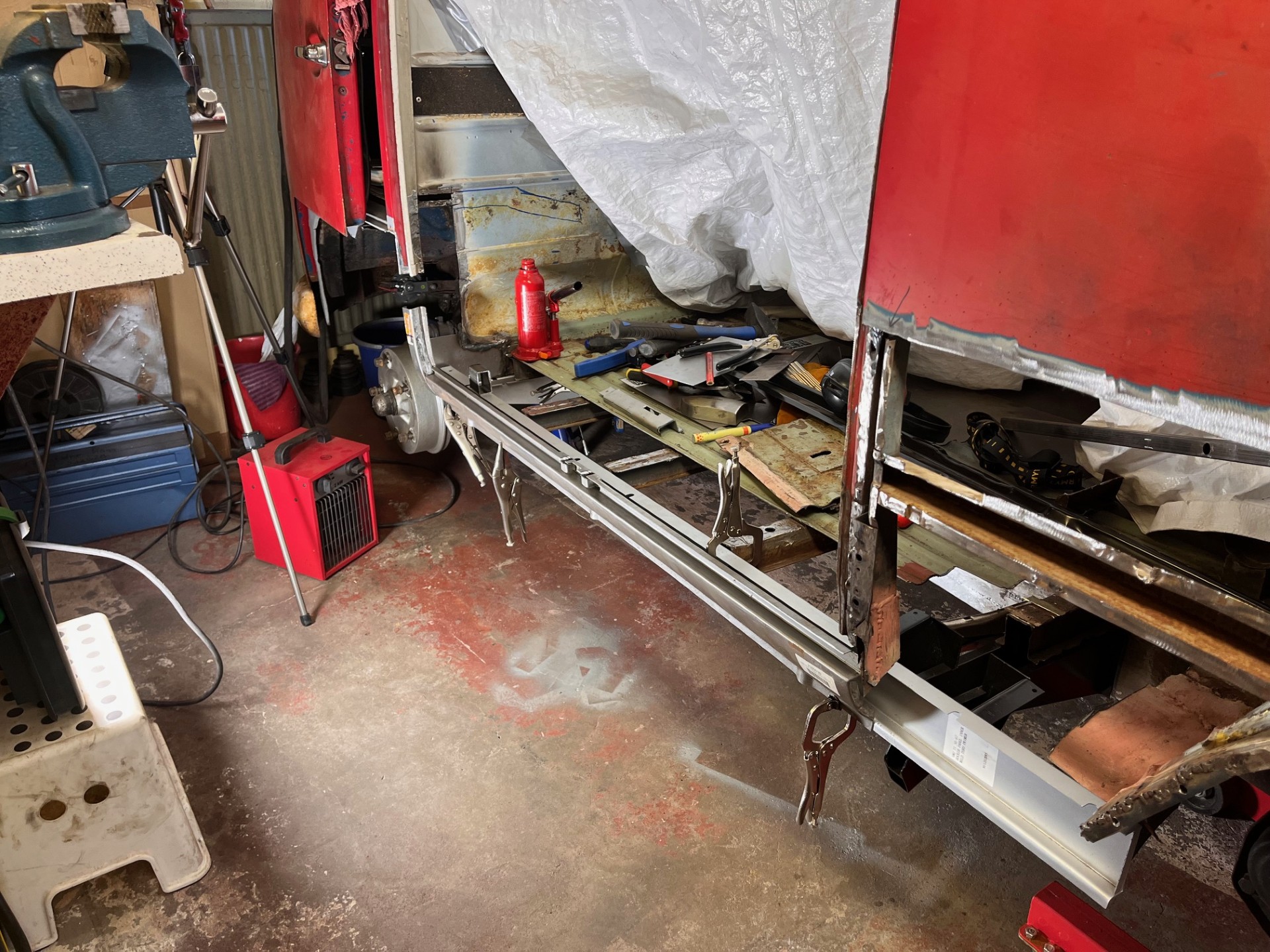 Min VW-buss har fått vila väl länge nu. I somras bestämde jag mig för att ta tag i ett begränsat projekt, för att åtminstone komma igång igen. En tröskel tänkte jag byta, lagom stort och avgränsat tänkte jag. I december körde jag igång vinkelslipen. Det begränsade projektet har naturligtvis vuxit, och omfattar nu den nedre regionen av i princip hela den vänstra sidan. Allt hänger ju ihop, och det är svårt med väldigt tydligt avgränsade reparationer. Men - det är kul! Tillbringar mycket tid i garaget, det är som terapi!