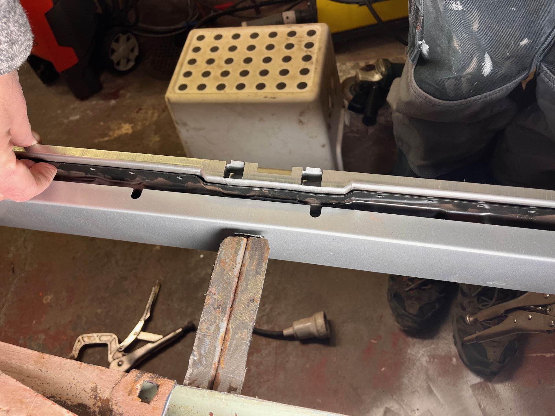 Precis, jag tänkte svetsa ihop den yttre och mittersta (förstärkningsplåten) först. Sen verkar det ju konstigt nog inte bara vara att lägga den ihopsvetsade prylen direkt mot den inre tröskeln, för gör man så verkar det inte passa med låsmekanismen, dörrarna etc. Men jag får testa mig fram och hitta rätt läge, och svetsa då allt ser ut att stämma.