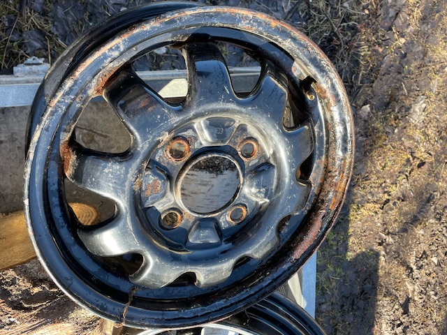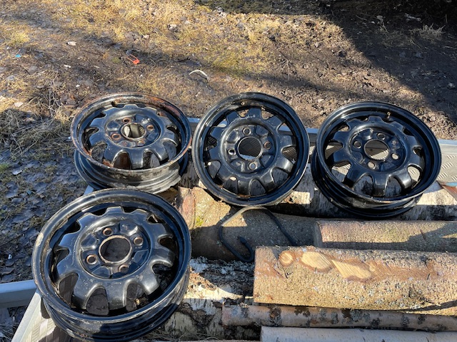 finns även en omgång maratonfälgar i orenoverat slitet bruksskick med cooper 165x-15" däck från nittonhundratalet, bra mönster, inga sprickor men tveksamt gamla. bud. hämtas.