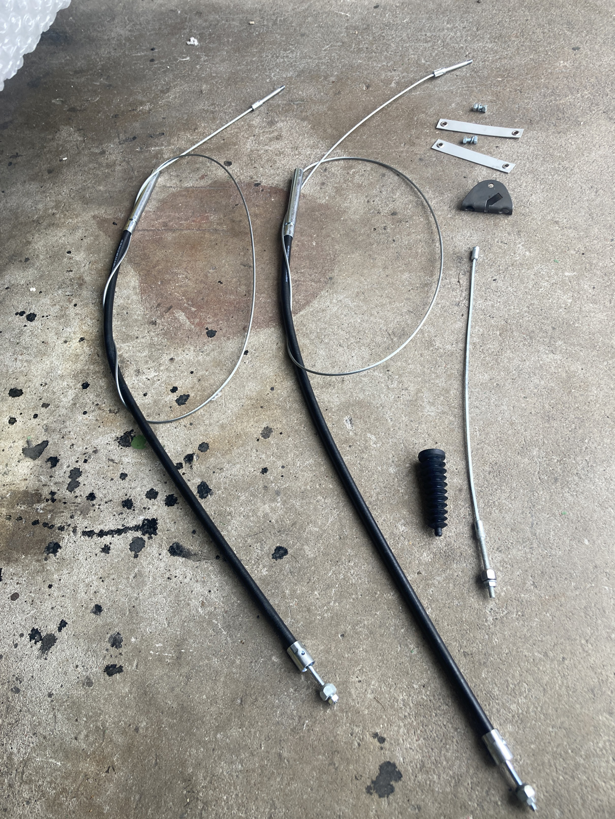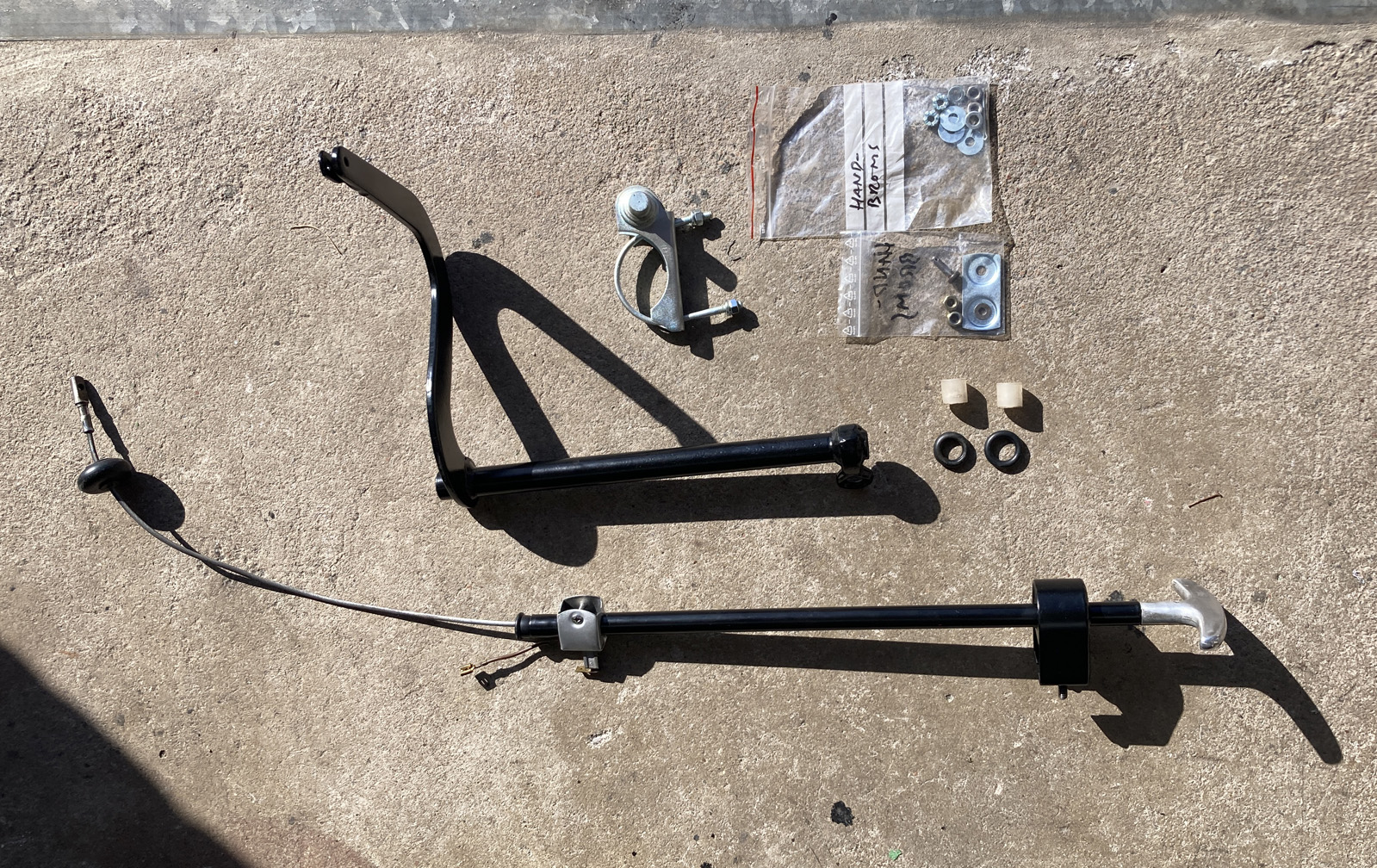 Samma visa med handbromsvajrarna. (på bilden på ingående delar saknas returfjädern som sitter i tunneln. Dessutom hade jag fått för korta straps som. De grå remsorna på bilden. Så det blir till att beställa nya.)