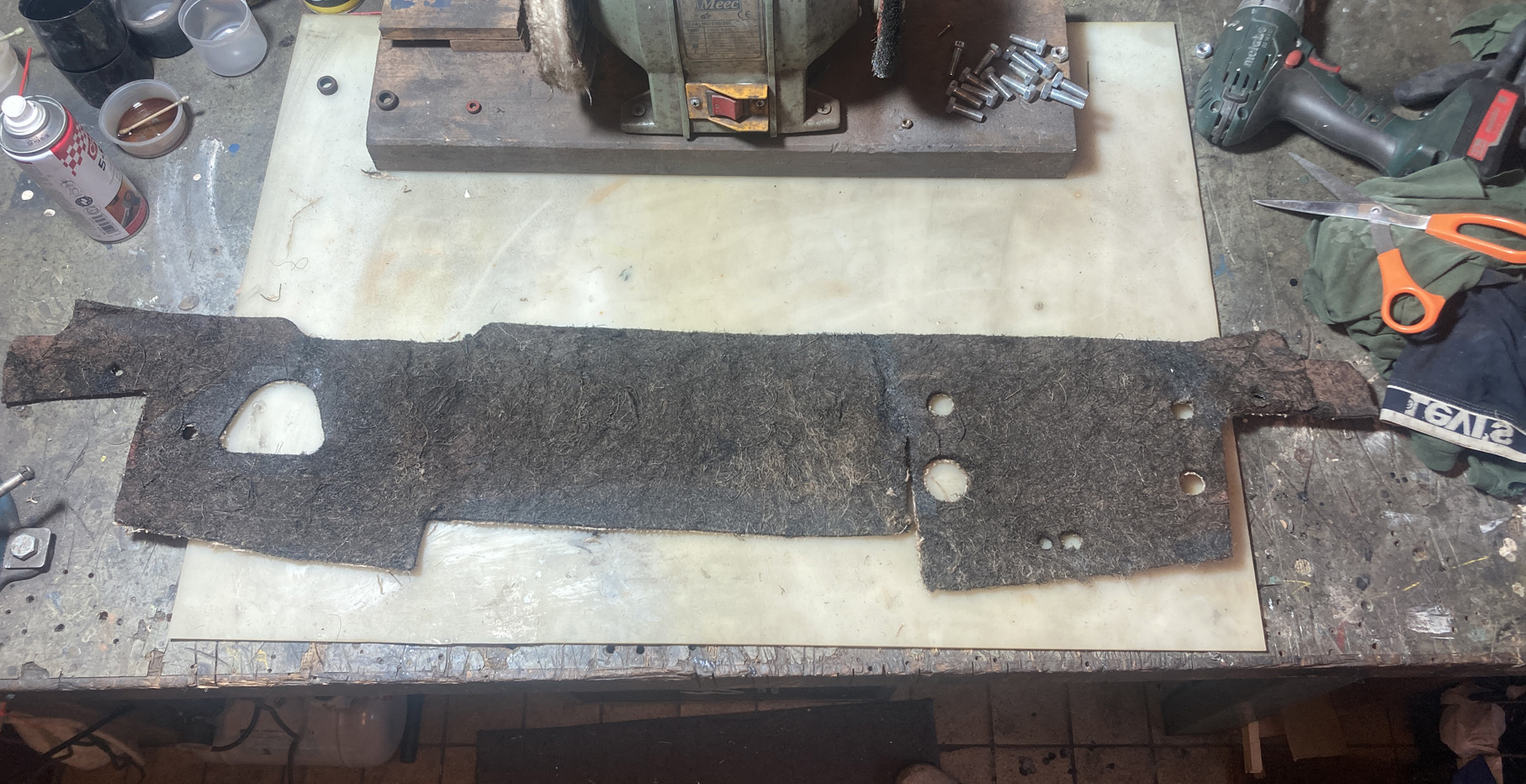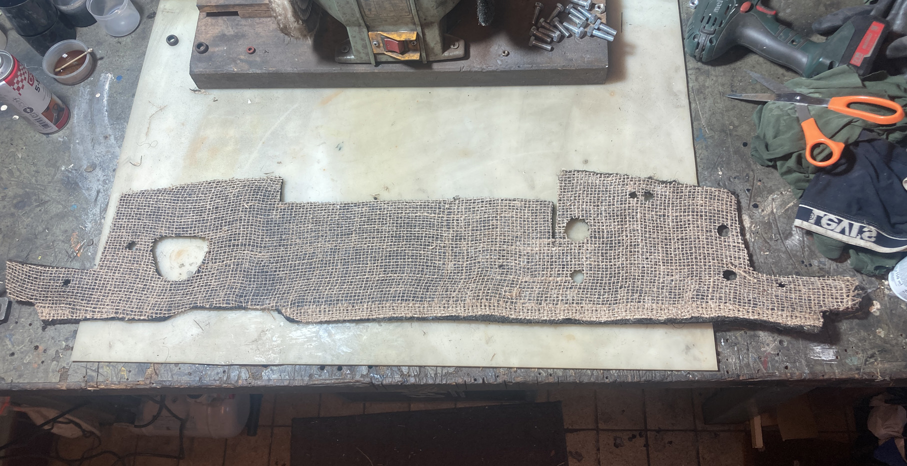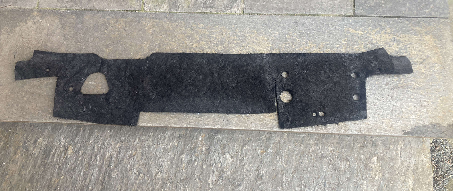 All ljudisolering i bagagutrymmet var borttagen när jag tog över projektet. Utom den biten som sitter på "torpeden". Det är ett ganska bösigt material, hästhår eller andra fibrer. Jag lät den ligga i tvållösning ett tag. Sedan när den torkat så förstärkte jag den på baksidan med juteväv och textillim.