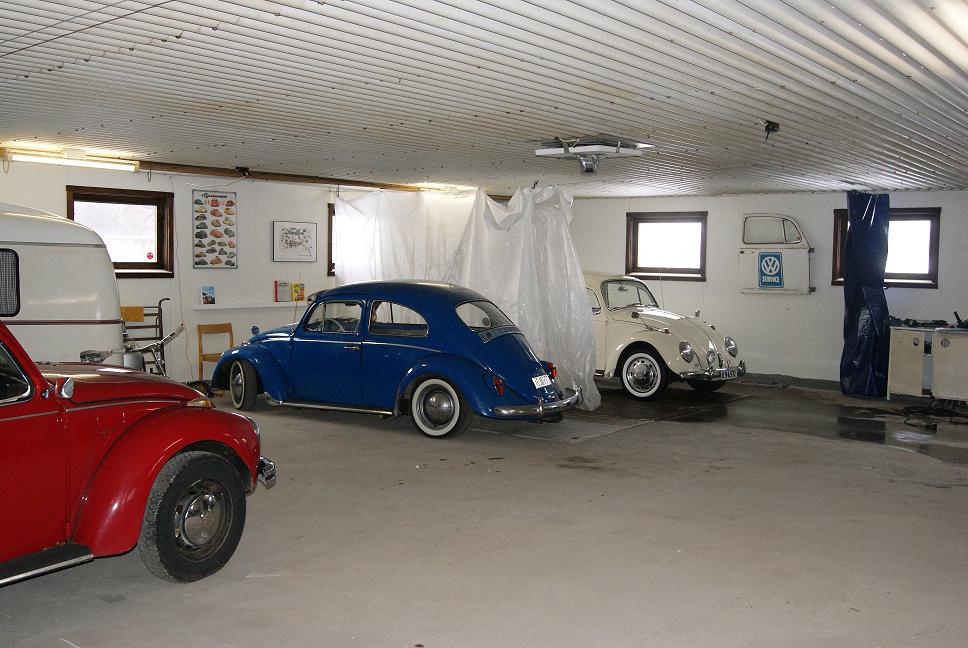 VW GARAGE MED FÖRHINDER P.G.A. HUSRENOVERING VILKET HAR INNEBURIT ETT GARAGE FULLT MED BYGGMATERIAL. INGET VW MEK ÄN PÅ ETT TAG SOM SYNES.Första bilden tagen på cabben från andra våningen som ligger över omklädnings,toalett och duschrum.Halva delen under våning två innehåller också arbetsbänkar och diverse maskiner. Våning två är tänkt som lite reservdelslager och lite "slappa"ställe att sitta och titta ut på vw-objekten, men det har inte blivit mycket med det inte.