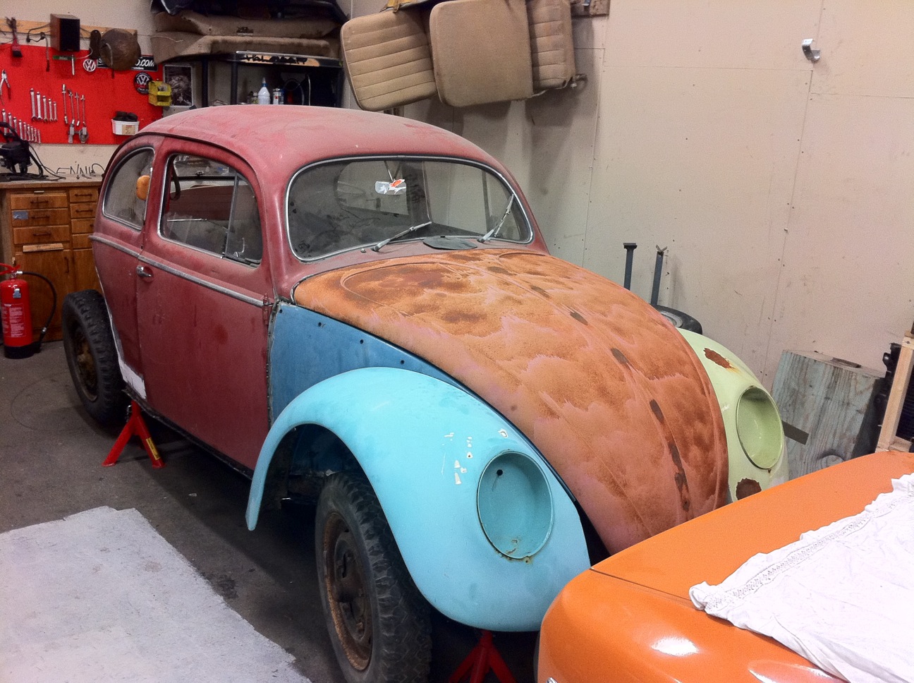 Svetsningarna är inte av "expert-typ" men väl dugliga, mesta av rosten är lagad, endast små kosmetiskt kvar. Bilen har fallit ur registret men har kvar gamla chassinumret samt alla papper från förr så det är peace of cake.