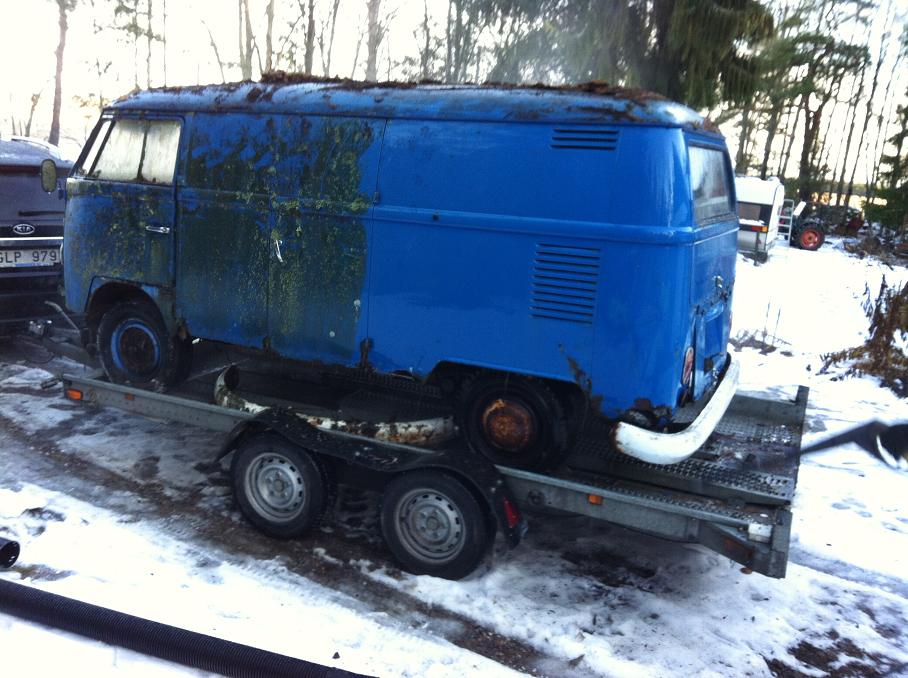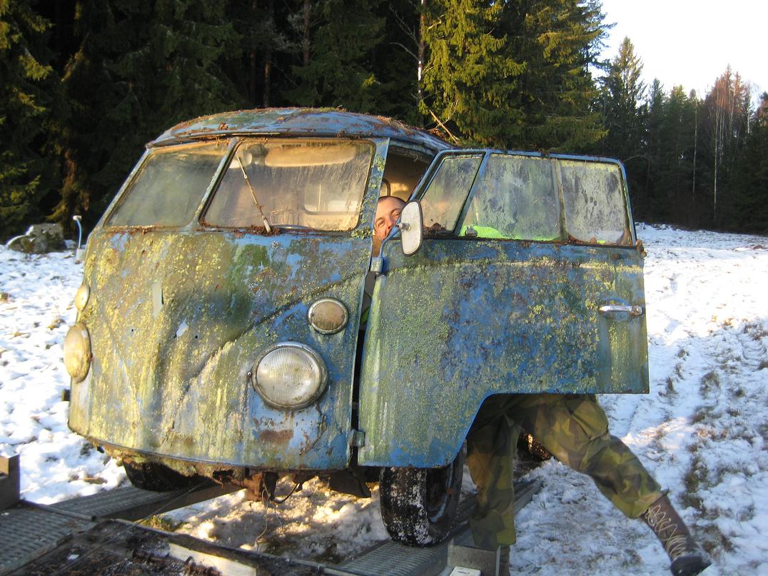 Jag & Olnordicflyer åkte ut på skrotsafari idag.. Hade fått tips om en ganska kass buss som ev hade ett okej tak att donera till Brent's 72 panel. Snön har vräkt ner i Umeå och under helgen har det dumpat upp mot 50 cm. Detta gjorde inte vår skrotsafari enklare ICQ/ab Efter lite bök kom vi tillslut fram till gården där bussen stod. Vid första anblick tänkte jag att "ja, det är väl bara att hämta elverket så kapar vi lös taket" men efter lite granskning konstaterade vi båda att denna är på tok för bra för att kapa sönder! Det är en 69:a klein som må se jävlig ut på bilderna men den är faktiskt galet bra för att ha stått på en åker i 10 år. Ingenting i plåtväg behöver bytas. Utriggar, golv, trösklar, skärmar m.m. är bra. Den är riktigt rak och fin o plåten. Ett väldigt tunt, torrt lager ytrost runtom på karossen ger rätt karaktär. Skjutdörren , rutor och alla soffor finns kvar. Osäker på stötfångarna. Motorn bör gå att få snurr på då den kördes till platsen den stod på. Om jag känner Brent rätt så kommer denna att toksänkas och det kan nog bli hur bra som helst ICQ/ab