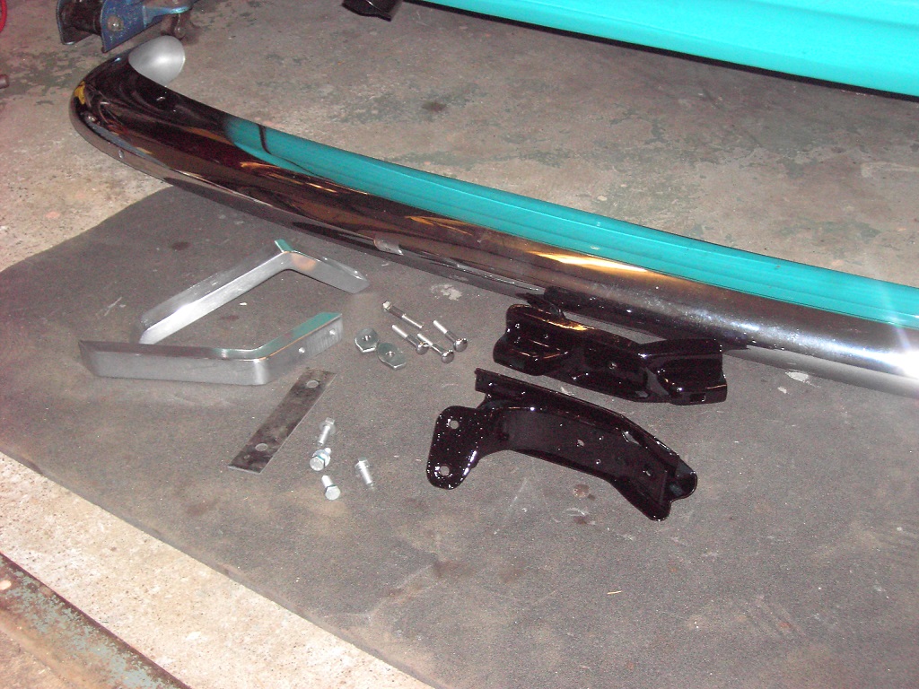 Igår monterade jag stötfångaren bak efter att först modifierat ett par NOS orginal fästen som kompletterades med vattenskurna aluminiumprofiler 20*30mm som slipats och polerats. Orginal fästen finns inte kvar och inte vill jag ha hål in till det som numera är bagageutrymme så därför fick det bli special. Gjorde även fästskruv av rostfria vagnsbult sattes upp i borr maskinen och bearbetades med vinkelslip och slippapper före polering.